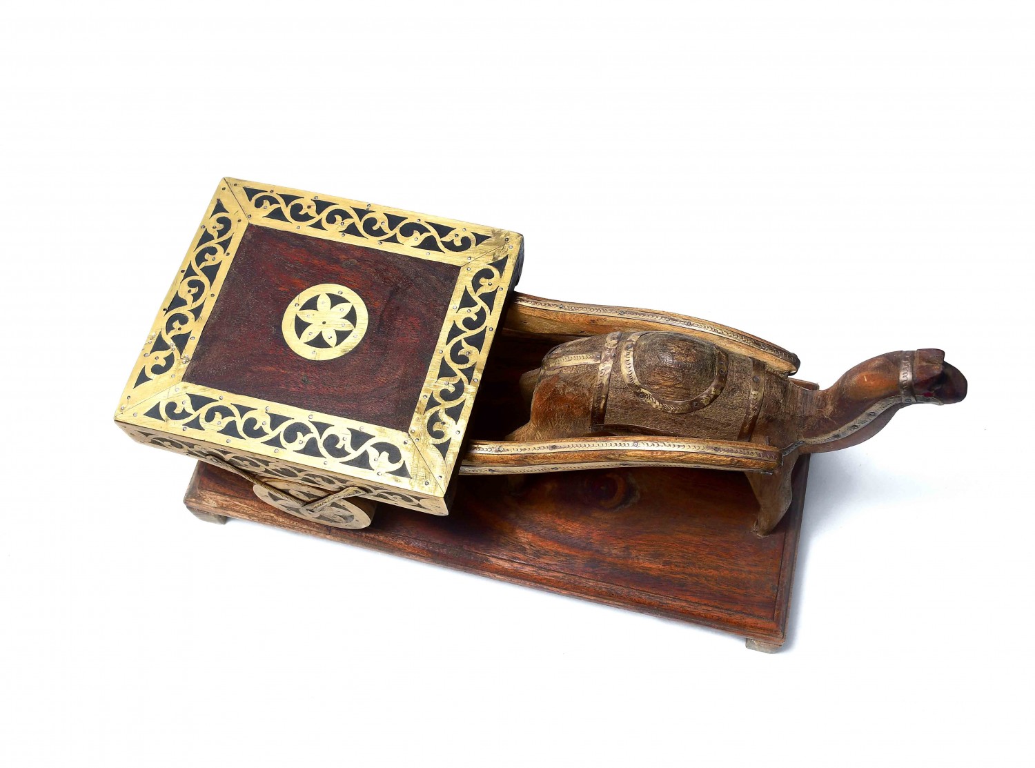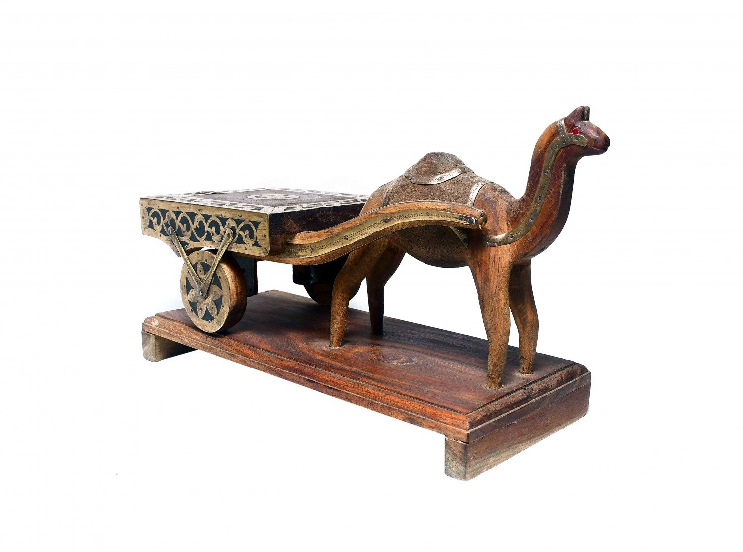 Camel Cart. It is made of wood, it is handmade, it has a beautiful brass carving over the wood, it is a very beautiful and well crafted showpiece, which draws a cart for you. These sightings are quite common on village streets, where camels are used to pull carts, and people use it as a means of transportation. It can also be a great gift option on various occasions.
