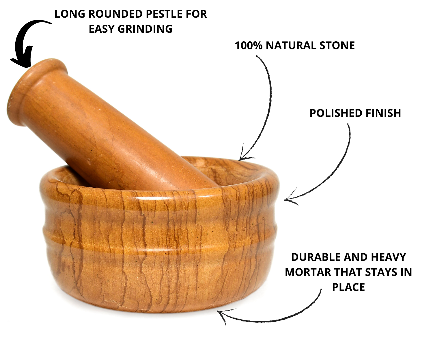 Barmer Bazaar Yellow Stone Mortar and Pestle Set for Spices is a pure stone traditional grinder that can be used for grinding spices and herbs. It is easy to use non-electrical appliances. It is made with natural rock and is thus hard, strong, and durable. Keep this traditional appliance in your kitchen for easy use.