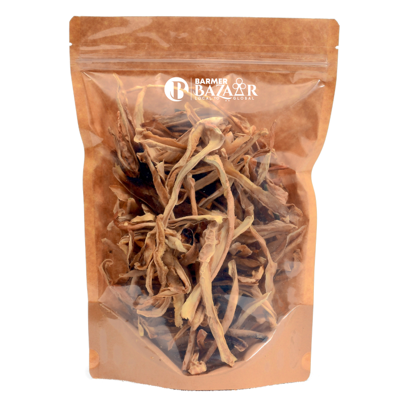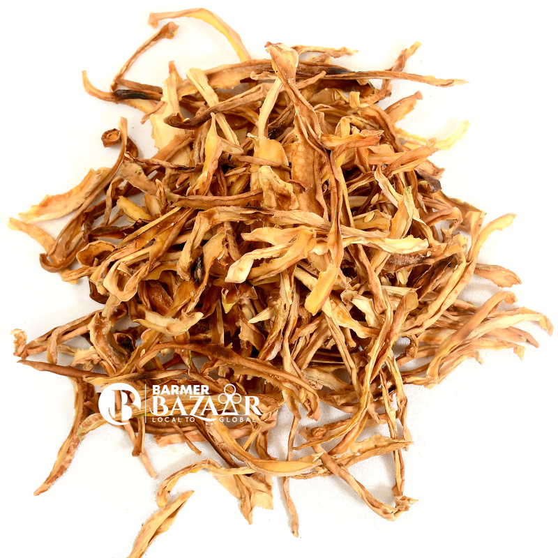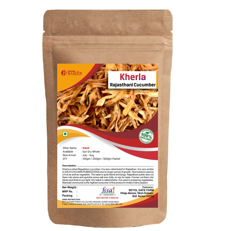 Khelra is dried Rajasthani cucumber. It is also called kakdi in Rajasthan. It is very similar to WILD CUCUMIS PUBSESCENS due to longer period of growth. Desi kakdi is used as a fruit as well as vegetable. The taste is quite bland and tangy. Rajasthani public also cut them into slices and sprinkled some salt and chilly on top for taste. Farmer cut them into slices and dries in sun light. Dry kakdi is called khelra. It is used in preparing vegetables. Jain community is the highest consumer of this product in India in rainy season.