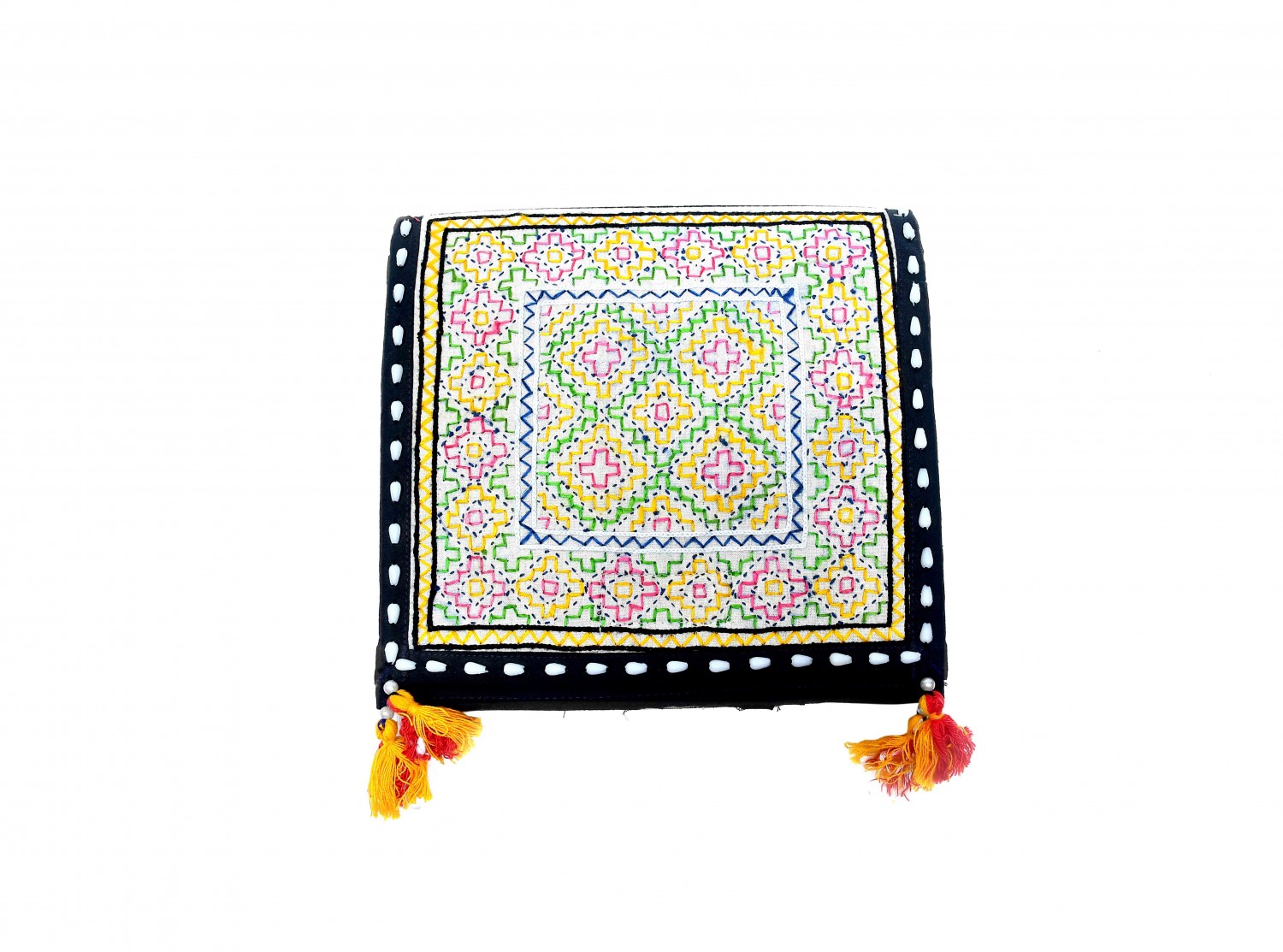 This sling bag adorned with Kamira embroidery, another special craft form of Barmer, is a great display and perfect mix of creativity, ethnicity and practicality. Vividly colourful embroidery done with silk and cotton threads and bordered with black looks stunning and can be carried easily. You can tuck in your small, necessary stuff like sunscreen, bottles and sanitizers before stepping out of the house.