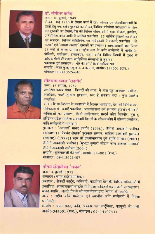 उपभोक्तावाद के इस दौर में बंशीधर तातेड़ को लोगों की भीड़ में इंसान ढूंढना पड़ रहा है। दुनिया में ईमान ढूंढना पड़ रहा है । माना कि आदमी खुदगर्ज हो रहा है, खून के रिश्ते भी रिश्ते सरीखे नहीं रहे। माना कि लेखक ऐसे हुक्काम खोजना चाहता है जो दुखियों के दुःख दूर करें। माना कि बापू के सत्य-अहिंसा कहीं दूर छूटते जा रहे है, पर इससे क्या जब तक जीवन है तब तक मनुष्य सुन्दर जीवन की कामना करता है। इंसान कभी भी आशा का दामन नहीं छोड़ता है। बुरी से बुरी परिस्थति में भी वह उम्मीद की लौ जलाए रखना चाहता है। तभी लेखक कहता है कि हौंसले से जो चला मंजिल पे होता है और यह भी माना कि ऊँचा है अम्बर, खोलें पंख उड़ान भरें। इस तरह की आशावादी पंक्तियाँ भरी पड़ी है पुस्तक में, जो हमें निरंतर आगे बढ़ने के लिए प्रेरित करती है और आज की यही जरूरत है। लेखक जीवन की सच्चाईयों को सूत्र वाक्यों में लिखता है जैसे कि भाग्य से ज्यादा मेहनत और पुरुषार्थ पर भरोसा करना चाहिए। हीरे मोती किनारे पर बैठने वाले को नहीं मिलते है वे तो उन्हें मिलते हैं जो समंदर में गहरे उतरते है। आगे तातेड़ जी सीख देते है कि कभी माँ का दूध मत लजाइए, लाचार का दिल मत दुखाइए, किसी के छालों पर नमक न छिड़किए. किसी गरीब का घर न जलाइए आदि।