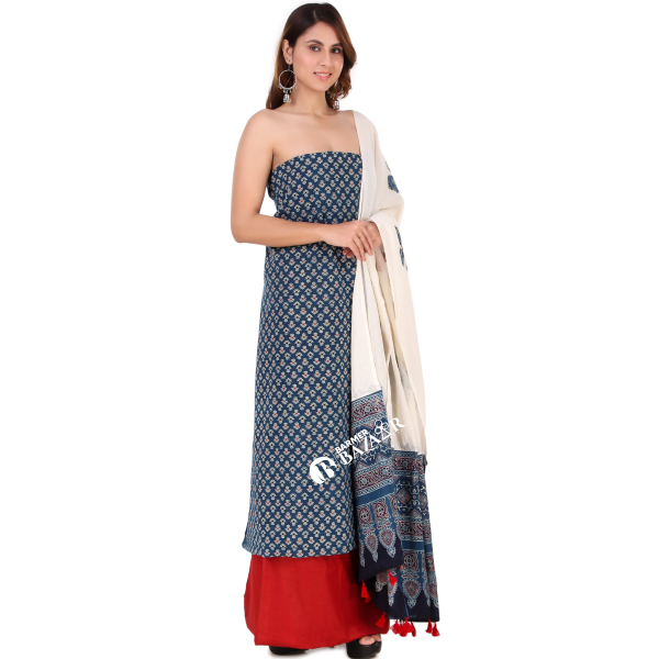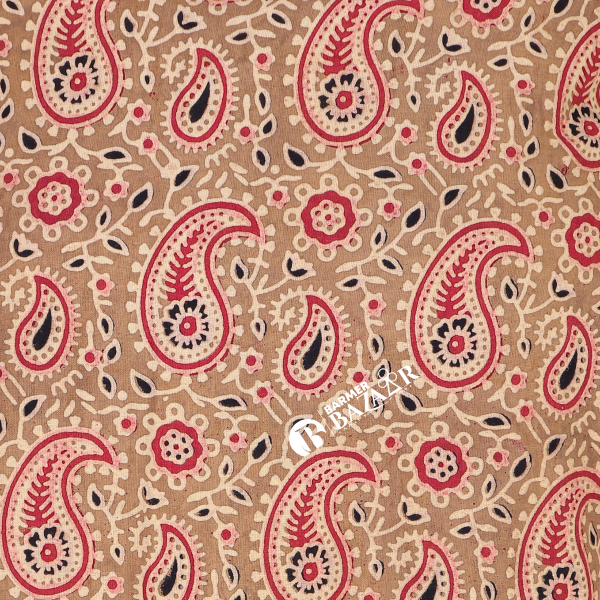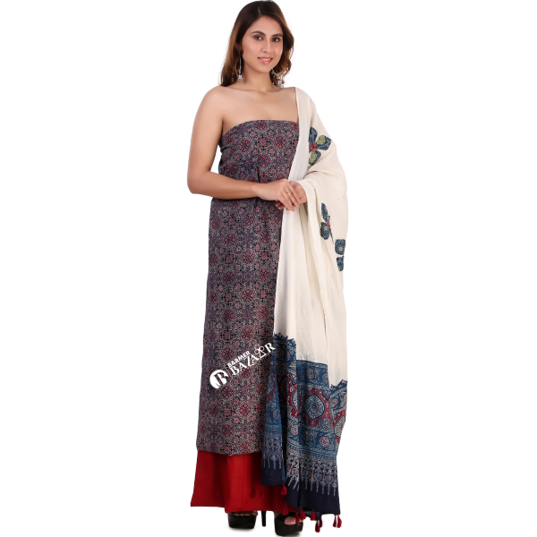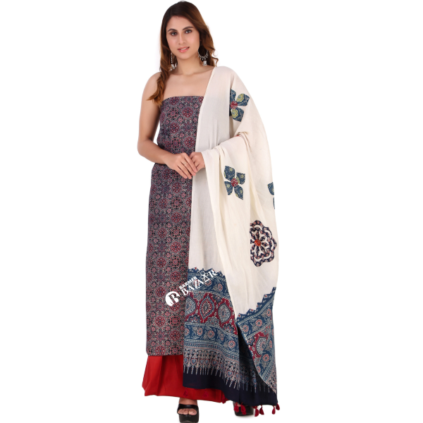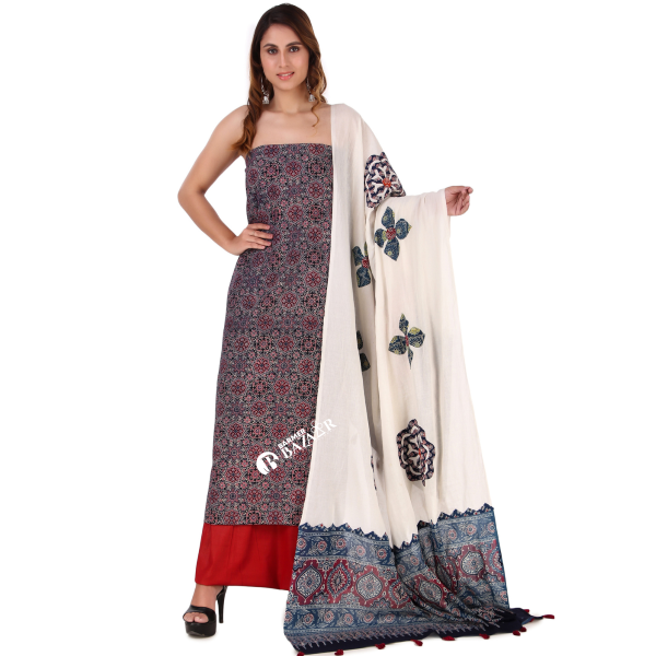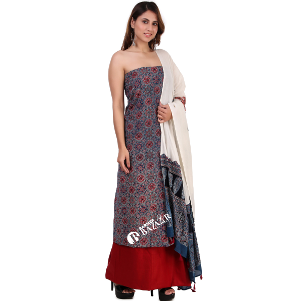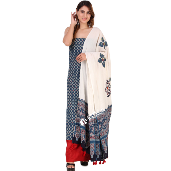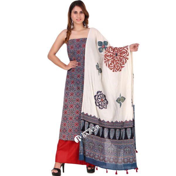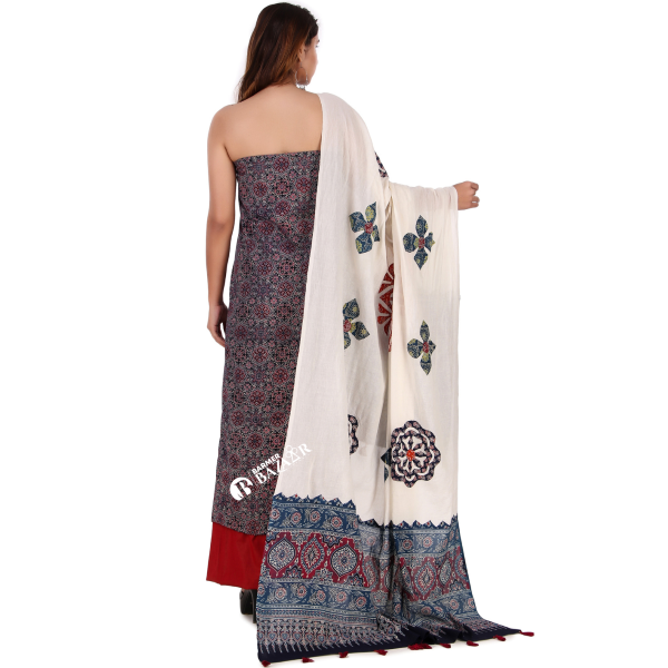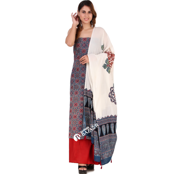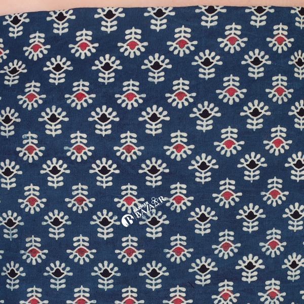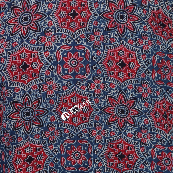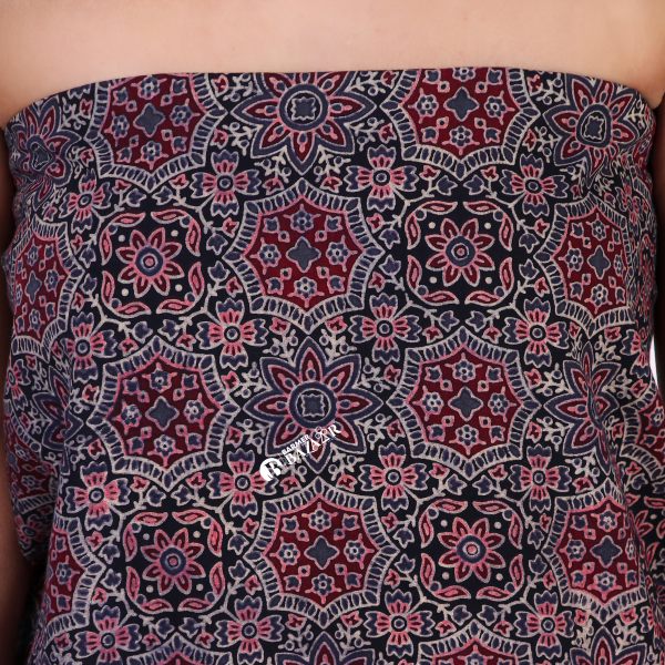 Ajrakh initially originated from Sind, Pakistan, as a legacy of Indus valley civilization around 3000 BC. It later on extended to the provinces of Kutch, Gujarat and Rajasthan too. As it is believed and historians have also stated, ajrakh is an Arabic word, which means blue, which is one of the most prominent colors in its creation. Ajrakh printing blossomed in India in the 16th century with the migration of Khatris from the Sind to Kutch district. It is said that the king of Kutch acknowledged and recognized the textile art, and encouraged the migration of Khatris to uninhabited lands in Kutch. Some Khatri printer families migrated to Rajasthan too and settled in and around Barmer province, including present-day Gujarat, and excelled at the art of ajrakh printing. Ajrakh printing has glimpses of nature in its prints and motifs. The colours in this form of print deeply resonate with the natural colours of nature. While Red symbolizes the earth, indigo blue symbolizes twilight, and Black and white are used with a view to outline motifs and define symmetrical designs. Also, the use of Eco-friendly natural dyes is gradually coming back into view too. Craftsmen used indigo plants growing along the Indus river whereas red is acquired from alizarin found in roots of madder plants. Black is obtained from iron shavings or millet flour and molasses along with the addition of ground tamarind seeds to thicken the dye. The contemporary ajrakh motifs have vibrant contrasting colours like rust, yellow and orange. Even in the motifs, the references of nature are evident as their jewel-like shapes symbolize natural elements like flowers, leaves and stars. The most common motif found in ajrakh printing is the trefoil which is made of three sun discs entangled together to represent the cohesive unit of the gods of earth, water and sun.