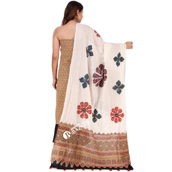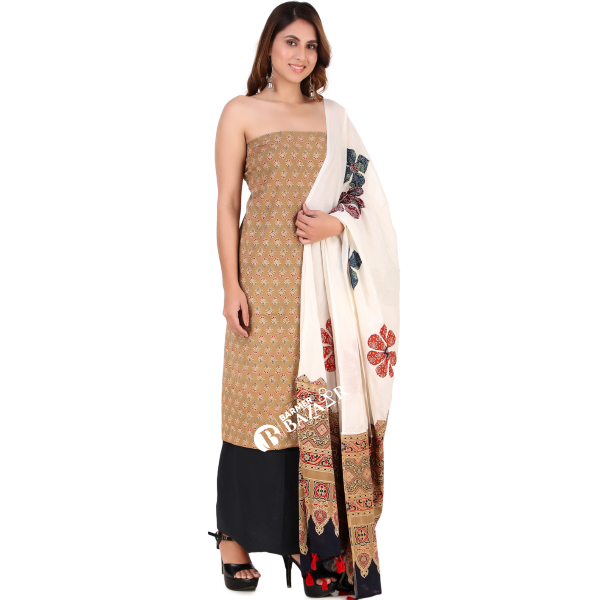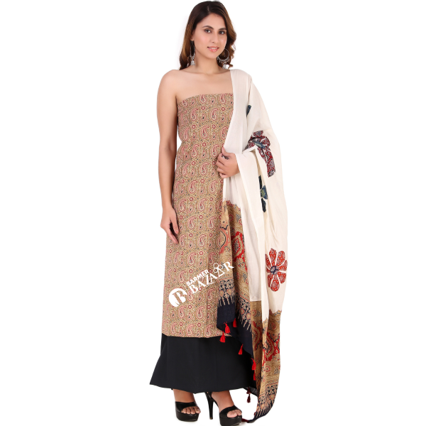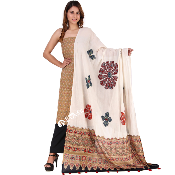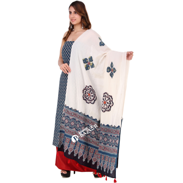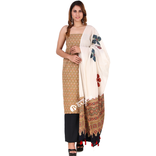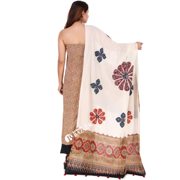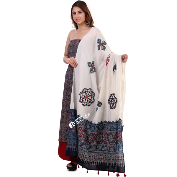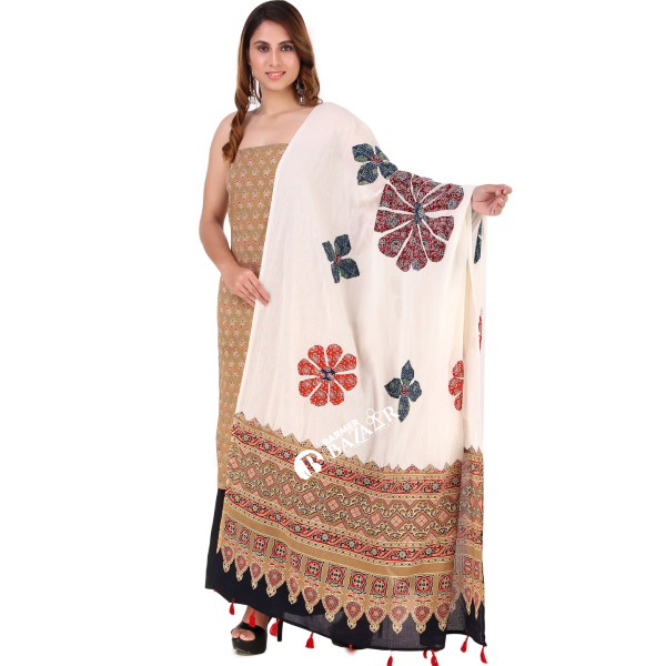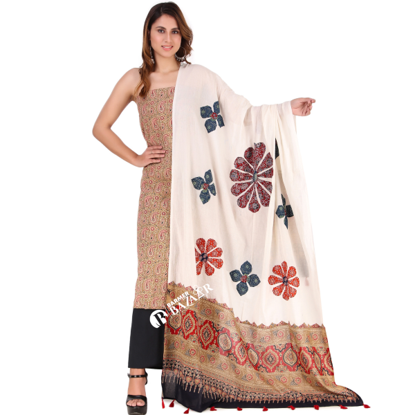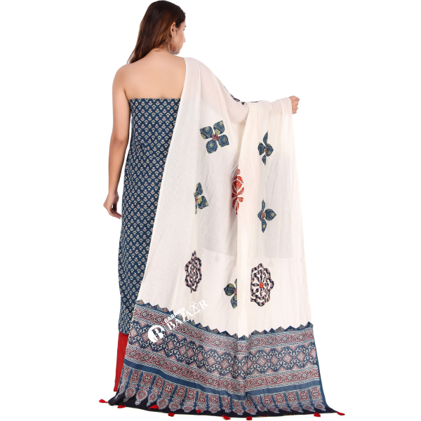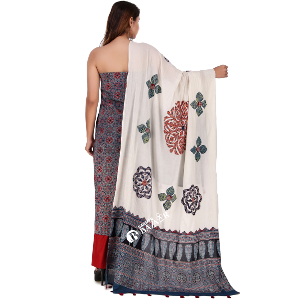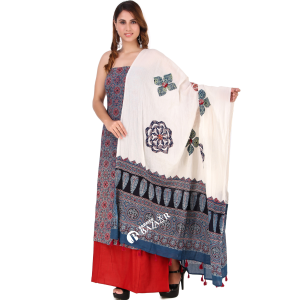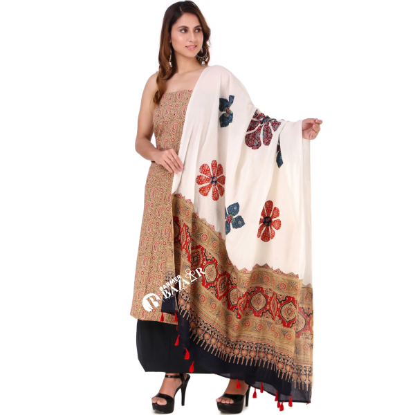 Ajrakh initially originated from Sind, Pakistan, as a legacy of Indus valley civilization around 3000 BC. It later on extended to the provinces of Kutch, Gujarat and Rajasthan too. As it is believed and historians have also stated, ajrakh is an Arabic word, which means blue, which is one of the most prominent colors in its creation. Ajrakh printing blossomed in India in the 16th century with the migration of Khatris from the Sind to Kutch district. It is said that the king of Kutch acknowledged and recognized the textile art, and encouraged the migration of Khatris to uninhabited lands in Kutch. Some Khatri printer families migrated to Rajasthan too and settled in and around Barmer province, including present-day Gujarat, and excelled at the art of ajrakh printing. Ajrakh printing has glimpses of nature in its prints and motifs. The colours in this form of print deeply resonate with the natural colours of nature. While Red symbolizes the earth, indigo blue symbolizes twilight, and Black and white are used with a view to outline motifs and define symmetrical designs. Also, the use of Eco-friendly natural dyes is gradually coming back into view too. Craftsmen used indigo plants growing along the Indus river whereas red is acquired from alizarin found in roots of madder plants. Black is obtained from iron shavings or millet flour and molasses along with the addition of ground tamarind seeds to thicken the dye. The contemporary ajrakh motifs have vibrant contrasting colours like rust, yellow and orange. Even in the motifs, the references of nature are evident as their jewel-like shapes symbolize natural elements like flowers, leaves and stars. The most common motif found in ajrakh printing is the trefoil which is made of three sun discs entangled together to represent the cohesive unit of the gods of earth, water and sun.