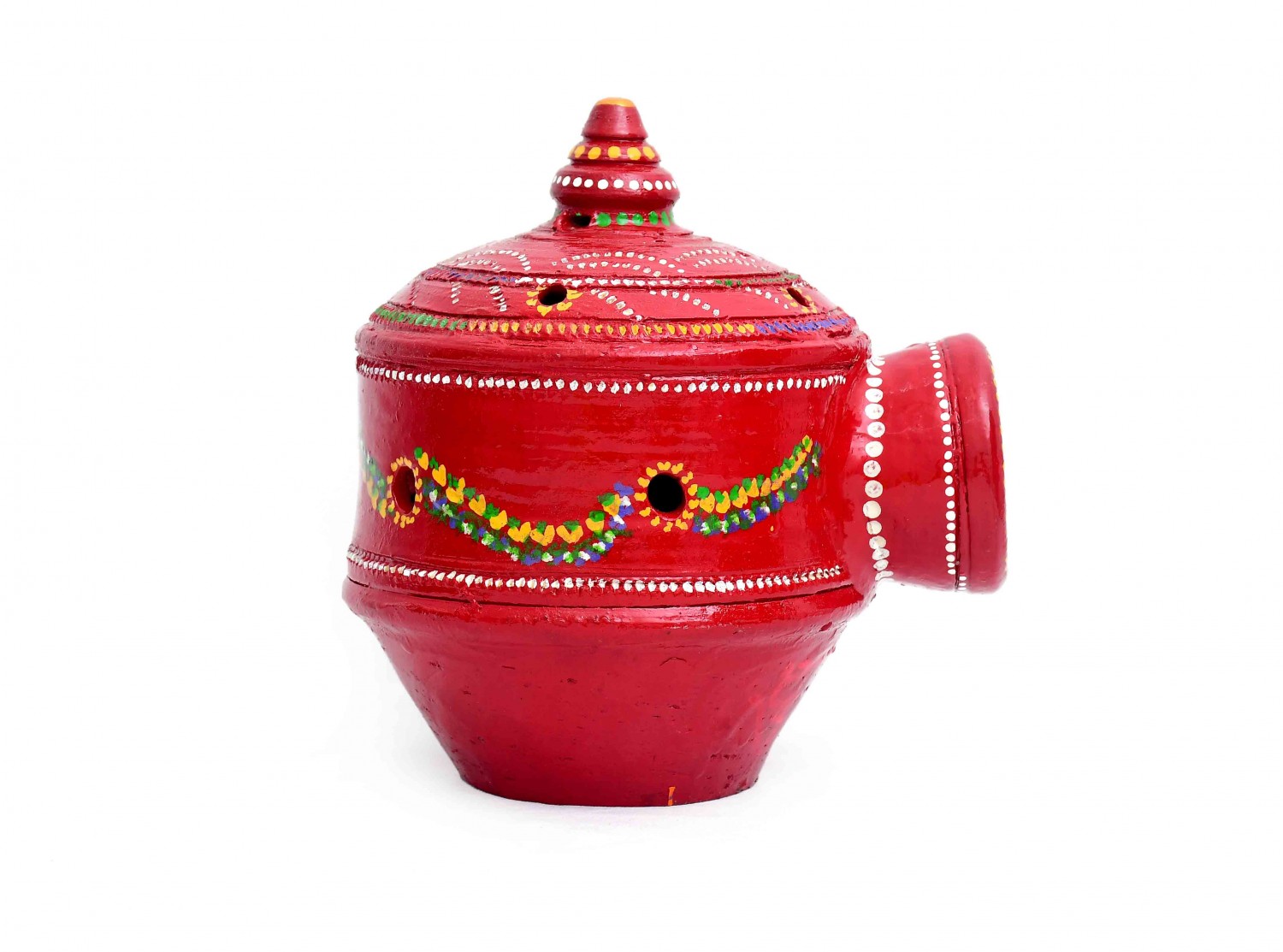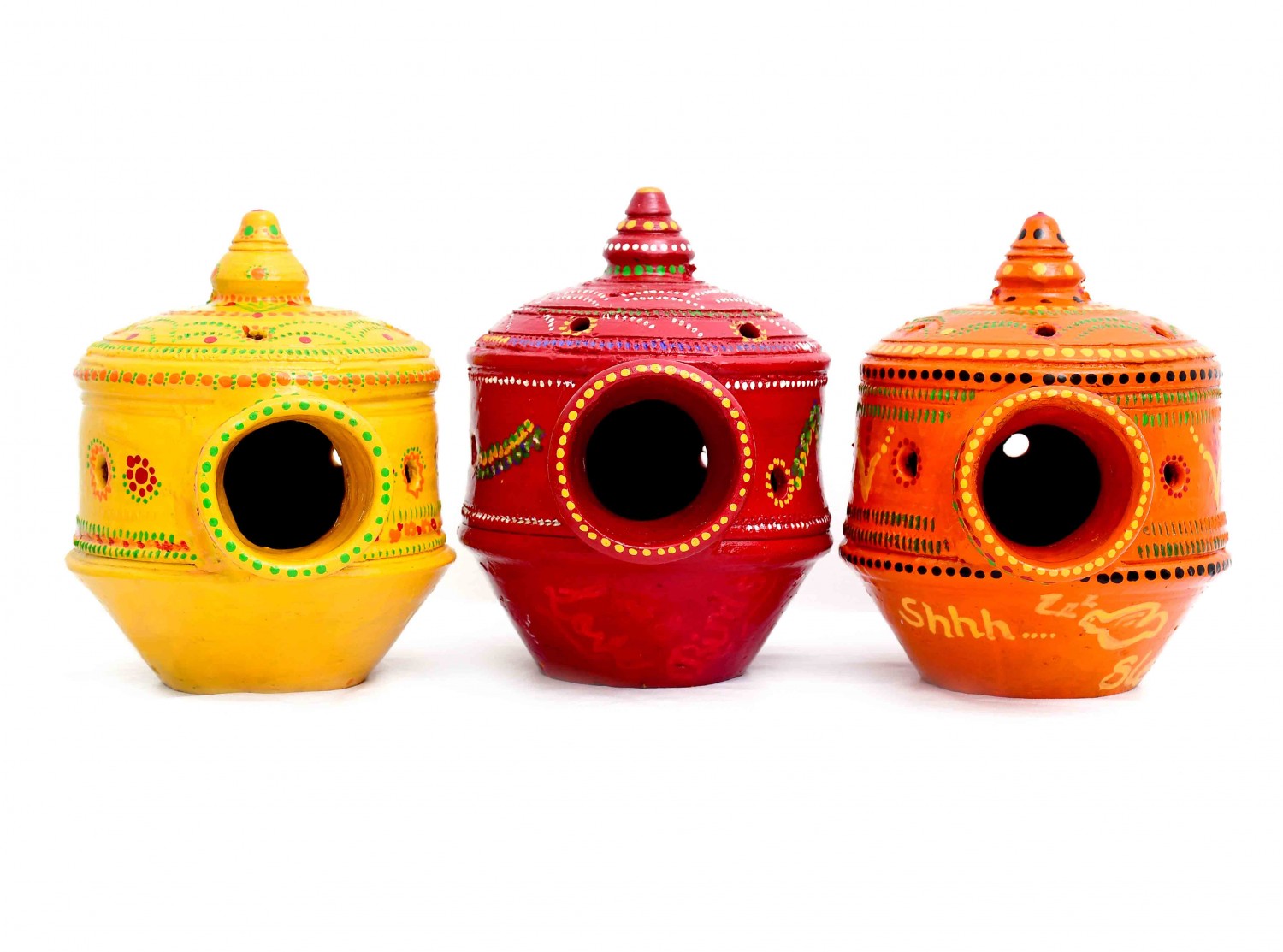The clay has been used to make gharonda, and it is handmade, after the gharada is made, it is attracted by using acrylic dyes on it. It takes four to five days to make gharada. You can use it to decorate your home. And birds can make their home in it.