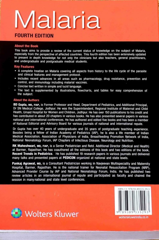 The book aims to provide a review of the current status of knowledge on the subject of malaria especially from the perspective of affected countries. This fourth edition has been extensively updated to present in depth knowledge for not only the clinicians.But also teachers, General practitioners and undergraduate and postgraduate medical students.
