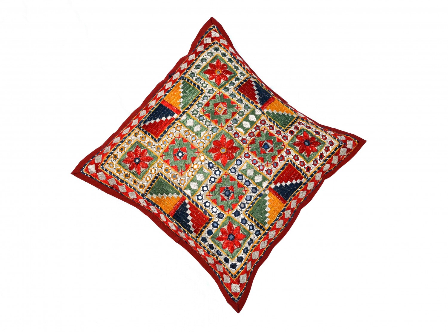 This cushion cover fabricated in the finest of the fabrics features a play of Embroidery on a background of Mehroon. The mirror work fills up the pattern adds up the charm to the base.