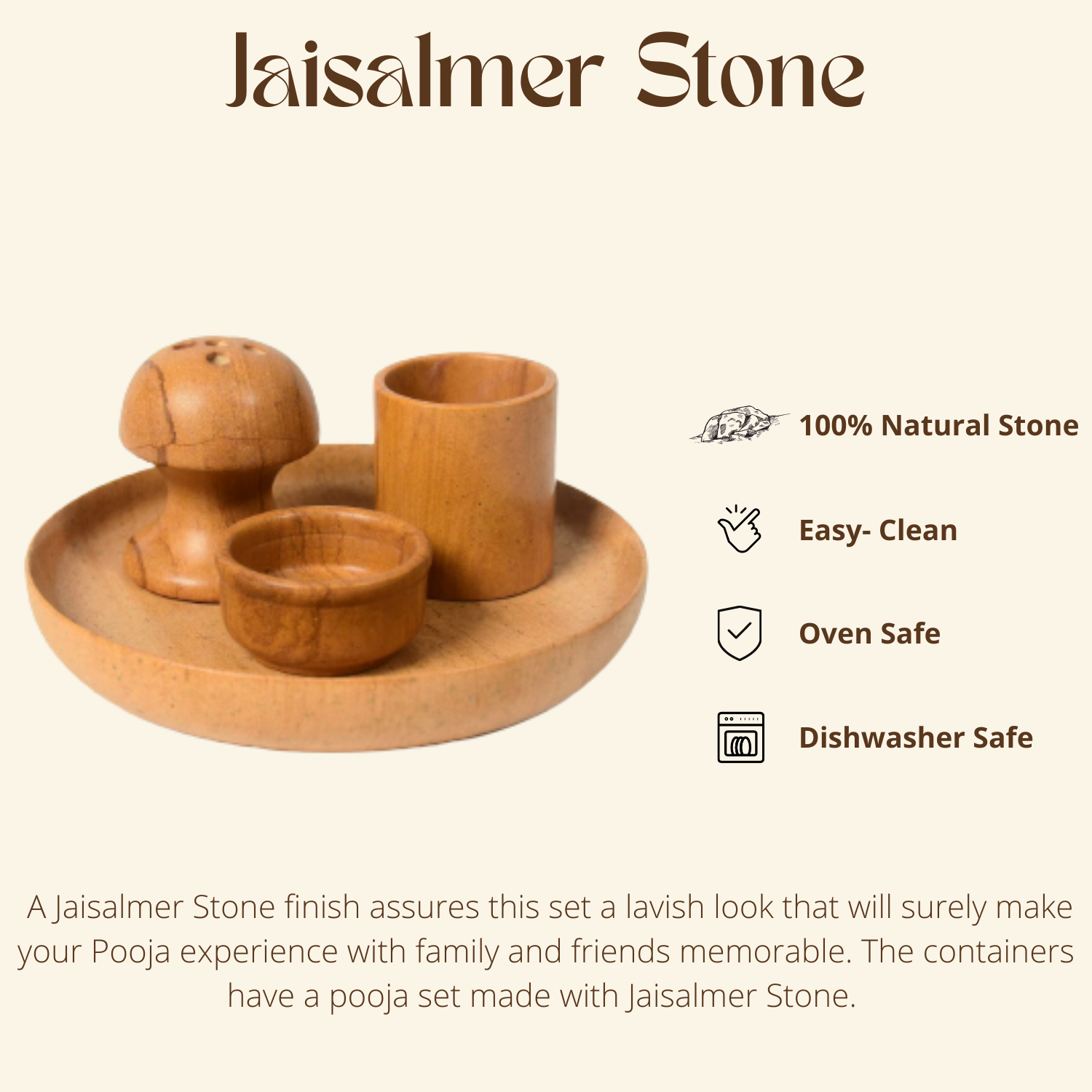 - This pooja thali is made of Jaisalmer Stone and this is a very attractive, elegant, and durable pooja thali